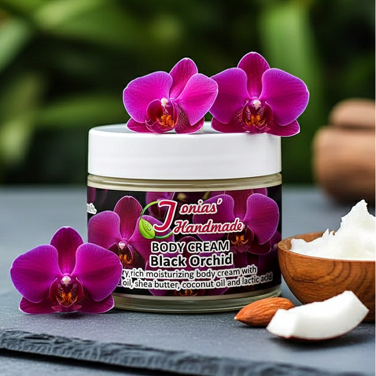 Distinctive Unisex Fragrance: Enjoy the complex and alluring notes of Black Orchid, a scent that's both elegant, memorable, and suitable for everyone. Deep Moisturization: Our rich cream, blended with almond oil, shea butter, coconut oil, and lactic acid, delivers intense hydration, leaving your skin feeling soft and smooth. Skin Renewal: Lactic acid gently helps to refine skin texture, promoting a healthy, radiant look. ( A vegan version omitting lactic acid is also available upon request)Handmade to Order: Each cream is freshly made to order, ensuring the highest quality. Consciously Crafted: We believe in clean beauty. Our formula is paraben-free, alcohol-free, and cruelty-free.